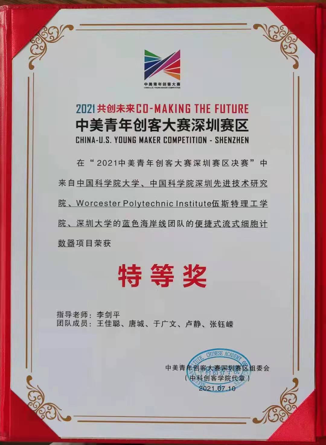 我们组建“蓝色海岸线”团队,参加了2021年中美青年创客大赛,并设计了一款便捷式流式细胞计数器FluoSieve® Counter,作品赢得了深圳赛区特等奖、全国赛区二等奖的佳绩。