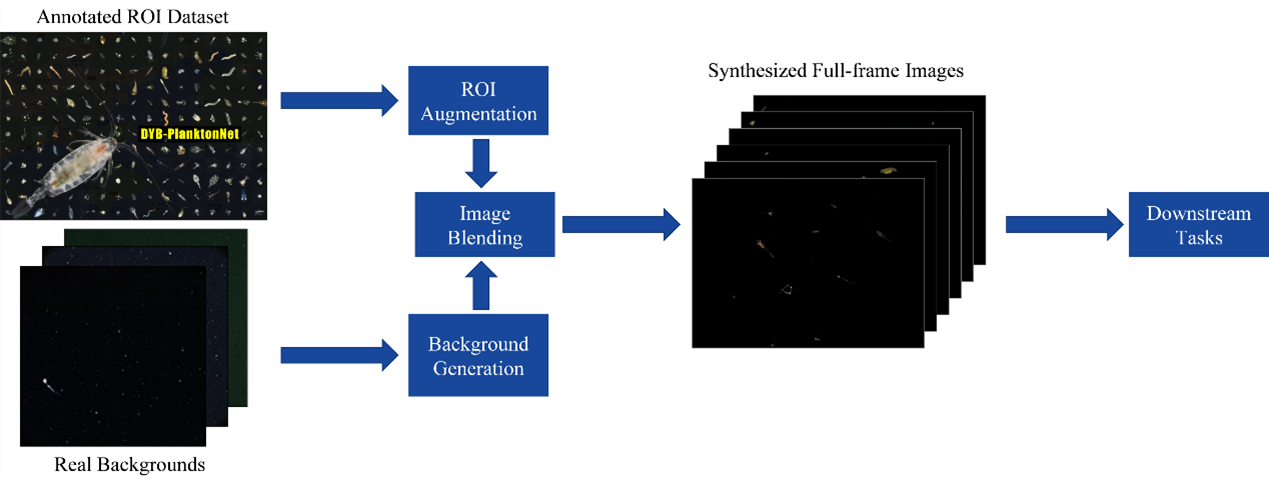 水下显微镜已被广泛开发用于获取原位图像以进行海洋浮游生物观测。然而,现有软件依赖传统阈值方法来分离单个目标,随后对提取的感兴趣区域(ROI)进行进一步处理以用于物种分类和计数。这种两阶段方法缺乏端到端的效率,且在真实海洋环境中面临挑战。我们提出了一种新的流程,该流程合成大规模、可控制且多样化的与真实原位图像相似的暗场图像,从而无需人工标注即可辅助浮游生物检测算法的训练。仅在该合成数据集上训练的 YOLO-v9 模型表现出出色的定位性能和对真实图像的强泛化能力。该方法充分利用已建立的 ROI 数据集,显著降低了对繁琐人工标注的依赖,为深度目标检测和分割网络的发展铺平了道路,最终提升浮游生物成像系统的自动化水平和性能。