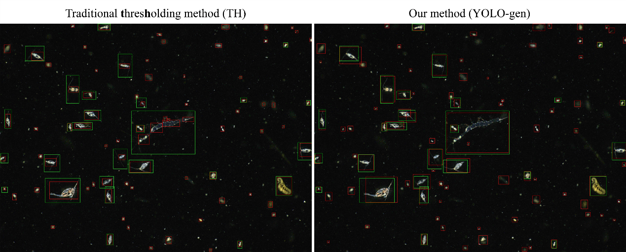 传统阈值方法(左)与YOLO模型(右)在真实原位暗场图像上检测结果对比